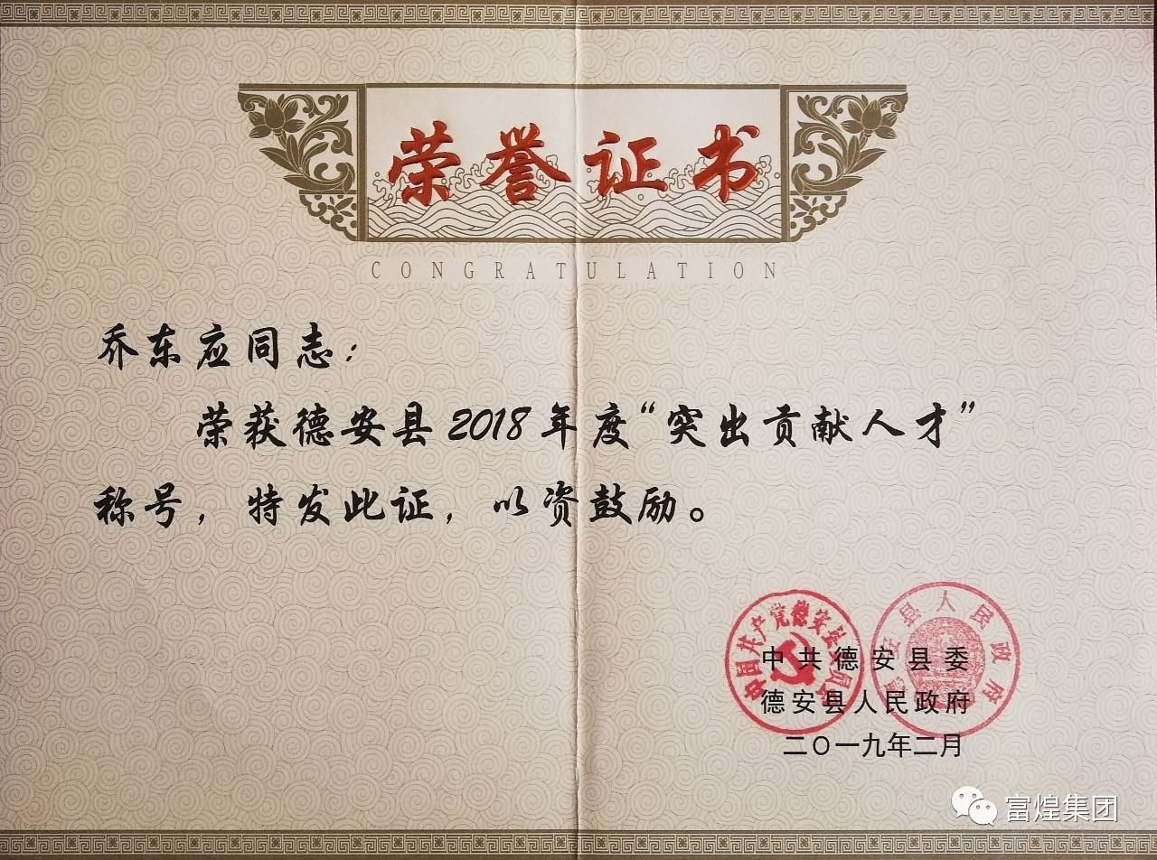 2018年,江西富煌在公司董事會(huì)的正確領(lǐng)導(dǎo)下,在集團(tuán)公司、物化探大隊(duì)及德安縣委、縣政府及相關(guān)部門(mén)的關(guān)心幫助下,全體員工團(tuán)結(jié)一心,取得了較好成績(jī)。德安縣委、縣政府對(duì)江西富煌取得的成績(jī)給予了充分的肯定,先后授予公司“2018年度德安縣工業(yè)企業(yè)規(guī)模獎(jiǎng)”、“2018年度德安縣工業(yè)企業(yè)貢獻(xiàn)獎(jiǎng)”、“2018年度德安縣重點(diǎn)納稅企業(yè)獎(jiǎng)”。同時(shí),德安縣委、縣政府對(duì)江西富煌總經(jīng)理喬?hào)|應(yīng)2018年度工作給予了高度評(píng)價(jià)和肯定,授予喬?hào)|應(yīng)同志“2018年度德安縣優(yōu)秀企業(yè)家”、“德安縣2018年度突出貢獻(xiàn)人才獎(jiǎng)”榮譽(yù)稱號(hào)。